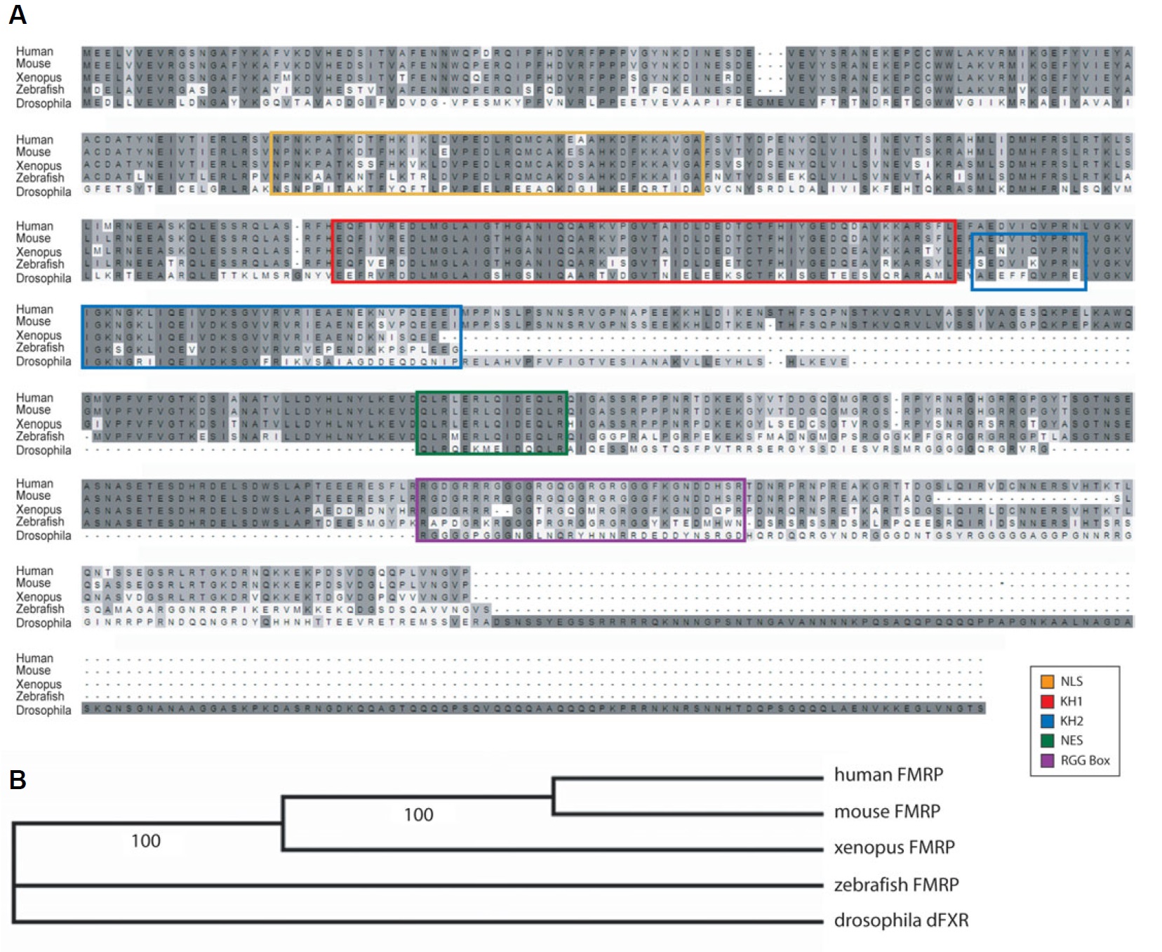 export signal; purple: RGG box). (B) Phylogenetic tree of FMRP sequences