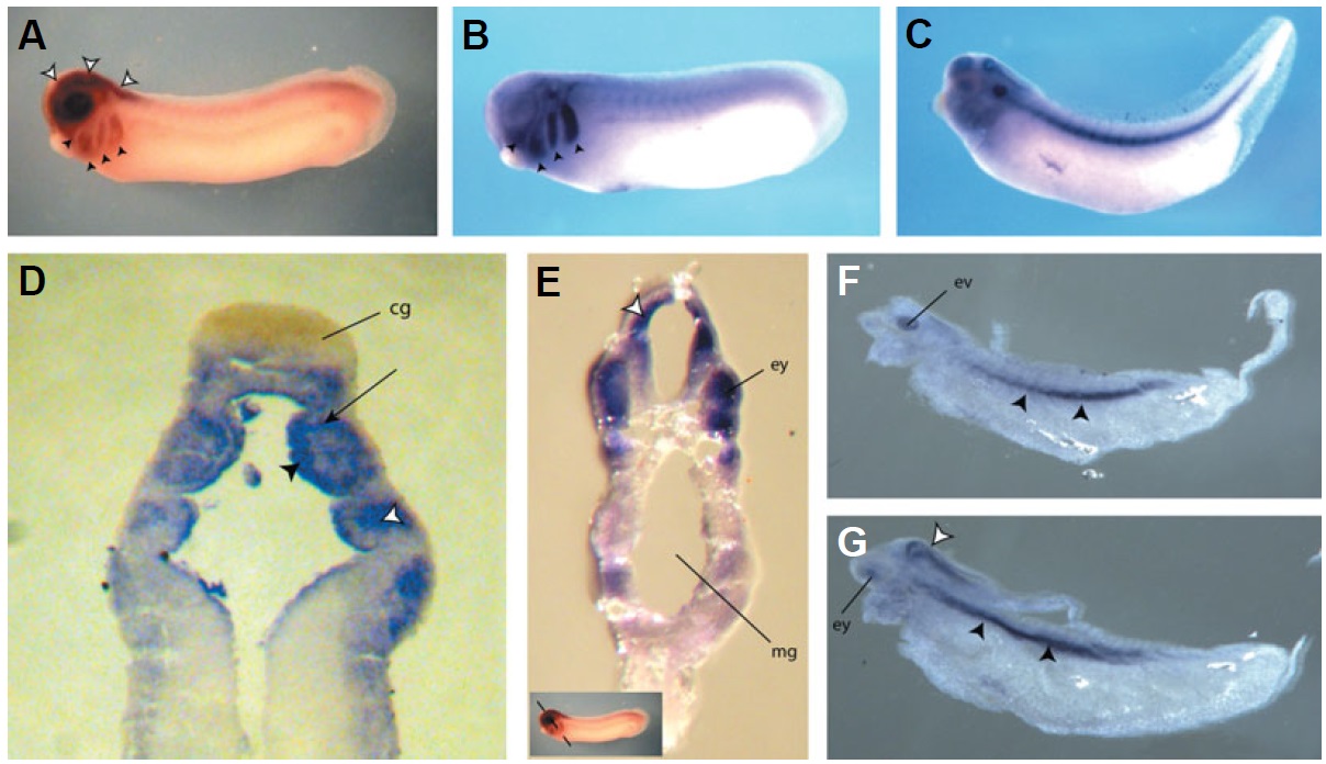 in the CNS (G: white arrowhead), craniofacial regions, notochord (F,G: black arrowheads), ear vesicle (F: ev) and eye (G: ey).