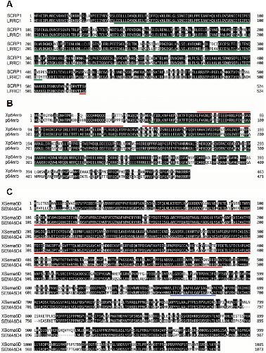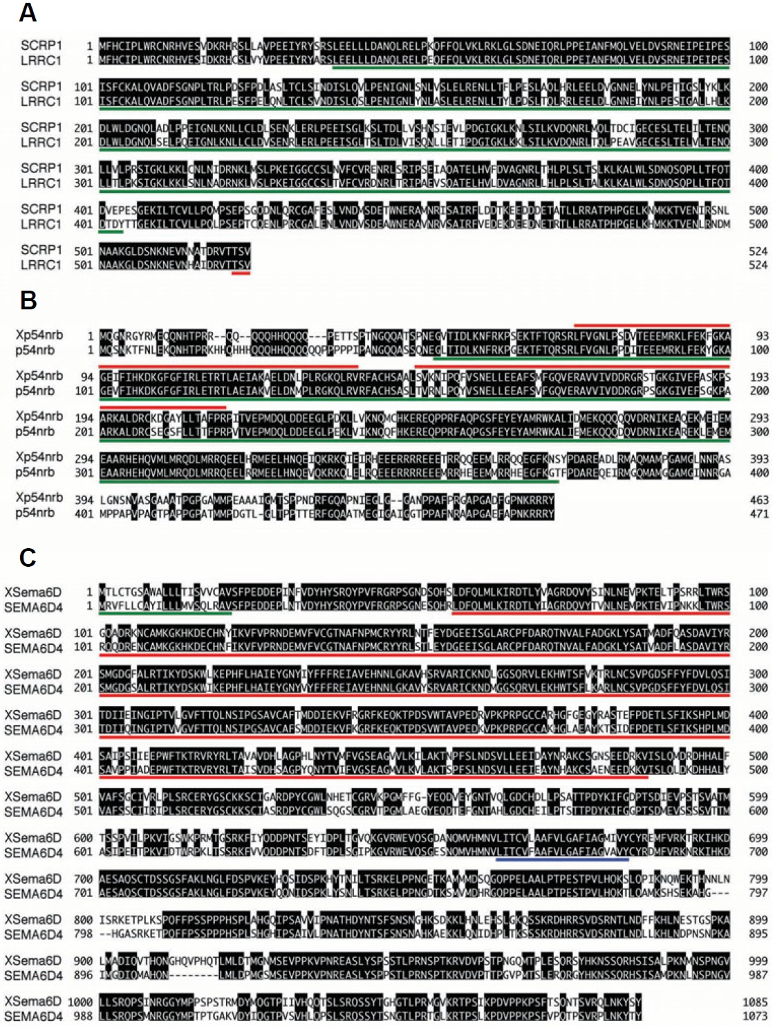 proteins in other species. (A) SCRP1 (N3A9) and human LRRC1 (AAH03193). Green line, LRR region; red
