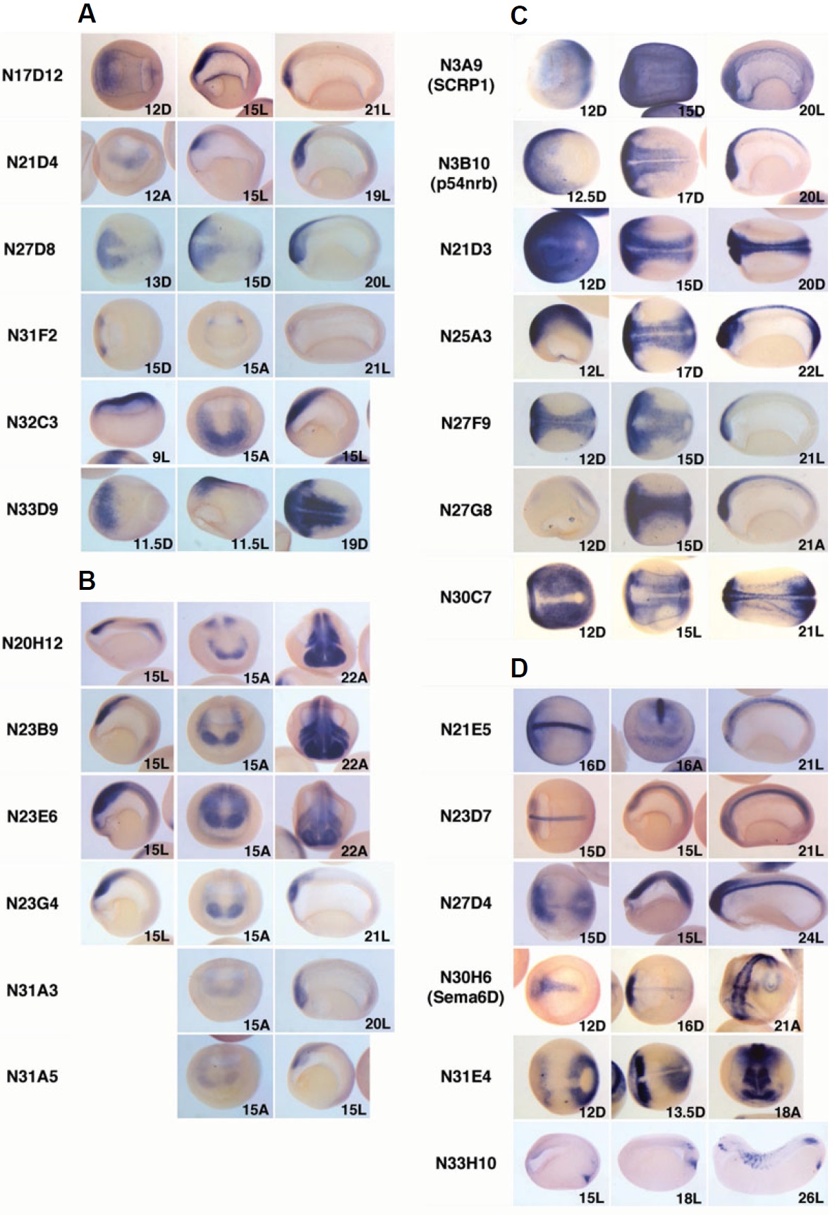 possible developmental regulators (Classes B, C and D), 757 clones from 729 clusters were analyzed for expression patterns by WISH and classified into