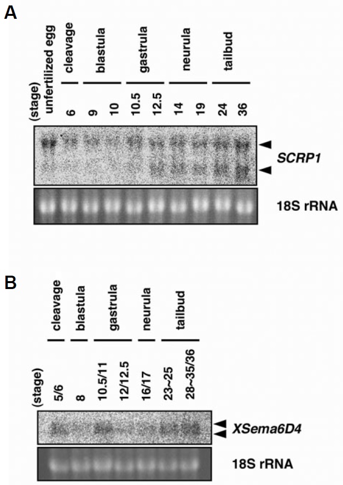 Fig. 5. Temporal expression profiles of Xenopus SCRP1 and XSema6D4