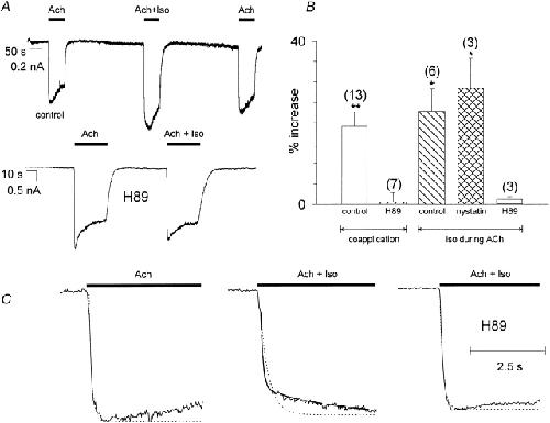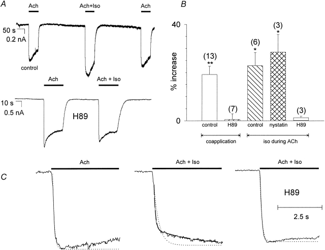 Figure 1. Effect of β-adrenergic stimulation on IKACh of rat atrial cells. (A) Original whole cell current recordings at a membrane holding potential of −80 mV. IKACh was induced by superfusion with ACh (10 μmol/liter) or ACh plus Iso (1 μmol/liter) in the absence (top) and in the presence (bottom) of 50 μmol/liter H89. (B) Statistics of the effect of Iso on IKACh amplitude, shown as percent increase compared with IKACh induced by ACh alone. Calculated average values ± SEM are shown; the number of individual cells is given in parenthesis. (* and **) Mean value deviates significantly (P < 0.05 and 0.01) from the H89 treated group. (Left to right) Effect of Iso coapplied with ACh (control, H89 treatment); additional IKACh induced by Iso application during ACh (control, IKACh recorded with nystatin perforated patch, H89 treatment). (C) Effect of Iso coapplication on kinetics of I KACh activation. (Left to right) Regular IKACh induced by ACh superfusion; IKACh induced by ACh coapplied with Iso; same as previous, but in the presence of 50 μmol/liter H89. (Dotted line) Monoexponential fit through the rising phase of I KACh. (Broken line) Biexponential fit, comprising a fast and an additional slow time constant.