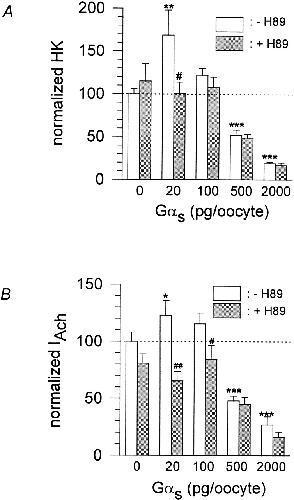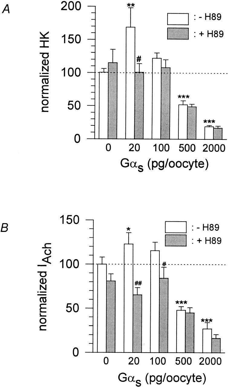 Figure 4. Effect of heterologous Gαs overexpression on basal and agonist-induced GIRK currents. (A) Statistics of effect of Gαs overexpression on basal current, normalized to basal IHK current of control (no Gαs overexpressed). Calculated average values ± SEM from two different batches of oocytes are shown (three to five oocytes per batch). Individual experiments were performed either in the absence (white bars) or after preincubation (gray bars) of oocytes in 50 μmol/liter H89. (# and ##) Mean value deviates significantly (P < 0.05 and 0.01) from the corresponding basal current (same amount of Gαs cRNA injected), but without H89 preincubation. (*, **, and ***) Mean value deviates significantly (P < 0.05, 0.01, and 0.001) from the basal current without Gα s overexpression. (B) Same as in A, but agonist-induced GIRK currents are normalized to IACh of control (no Gαs overexpressed).
