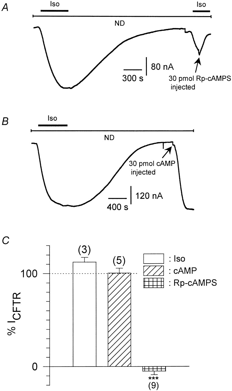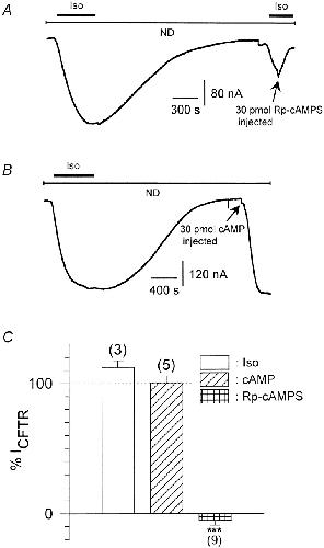 Figure 2. Stimulation of PKA by β2AR in Xenopus oocytes. (A) Original current trace from an oocyte expressing CFTR Cl− channels and β2AR recorded at a holding potential of −80 mV in ND96 solution. Upon isoproterenol superfusion (1 μmol/liter), CFTR channels were stimulated by PKA phosphorylation, what could be reversed by washing out of the agonist. During the second application of Iso, 30 pmol Rp-cAMPS were injected into the cytosol, abolishing and reversing the effect of agonist. (B) Same as in A, but instead of the second Iso pulse, 30 pmol cAMP was injected, stimulating CFTR channels to the same extend as the Iso pulse. (C) Statistics of stimulation of CFTR by agonist and/or cAMP and analogues normalized to a first, control pulse of Iso (taken as 100%). Calculated average values ± SEM are shown; the number of individual oocytes is given in parenthesis. (***) Mean value deviates significantly (P < 0.001) level from the group injected with stimulatory cAMP analogues. (Iso) After washing out of the first Iso pulse, 5 nl H2O were injected into the oocyte, and then the magnitude of CFTR currents elicited by a second pulse of Iso was measured. (cAMP) After the first pulse of Iso superfusion, 30–60 pmol cAMP (n = 3) or Sp-cAMPS (n = 2) were injected into the cytosol and the resulting CFTR currents were measured. (Rp-cAMPS) Same as cAMP, but Rp-cAMPS was injected instead of stimulatory cyclic nucleotides.