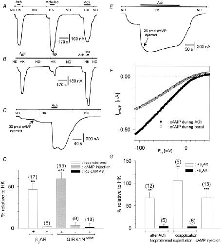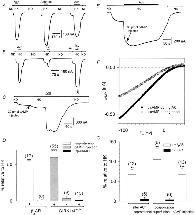 Figure 3. β2-adrenergic facilitation of heterologously coexpressed GIRK currents and cAMP effects in Xenopus laevis oocytes. (A) Original current trace recorded at a membrane holding potential of −80 mV. ND and HK denote changes of the superfusion medium from ND96 to HK, bars denote superfusion with agonists. (B) Same as in A, but Iso was applied alone or during ACh. (C) Same as in A, but 30 pmol cAMP was injected during HK before ACh superfusion. (D) Statistics of the effects of isoproterenol superfusion and/or cytosolic injection of cAMP and Rp-cAMPS on basal current amplitude, expressed as percentage of basal I HK. Calculated average values ± SEM are shown; the number of individual cells is given in parenthesis. (** and ***) Mean value deviates significantly (P < 0.01 and 0.001) from the corresponding control group (i.e., oocytes not expressing heterologous β2AR in the case of Iso effects) or cAMP injection into native oocytes in the case of cAMP effects. (Left to right) Iso-induced current on basal HK (with or without coexpressed β2AR), 30–60 pmol cAMP injection during basal HK, cAMP injection into native oocytes, injection of 30–60 pmol Rp-cAMPS during basal HK. (E) Same as in C, but cAMP was injected during ACh. (F) Current–voltage relation of the cAMP-induced currents as measured by a triangular voltage pulse (f = 1 Hz). (○) Current induced by cytosolic cAMP injection on basal current, obtained by subtraction of the basal current before cAMP injection from basal current after cAMP injection. (•) Current induced by cAMP injections on ACh-induced currents. (G) Statistics of the effects of isoproterenol superfusion and/or cytosolic injection of cAMP on ACh-induced current amplitude, expressed as a percentage of basal IHK. Calculated average values ± SEM are shown; the number of individual cells is given in parenthesis. (** and ***) Mean value deviates significantly ( P < 0.01 and 0.001) from the corresponding control group (i.e., oocytes not expressing heterologous β2AR in the case of Iso effects) or cAMP injection into native oocytes in the case of cAMP effects. (Left to right) Iso effect during ACh (with or without β 2AR), Iso effect upon coapplication with ACh (with or without β2AR), cAMP injection during ACh.