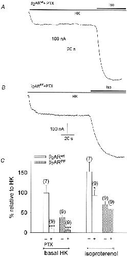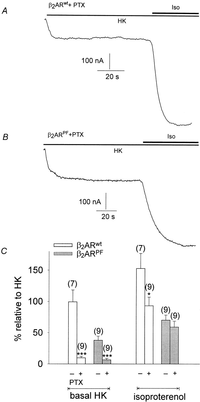 Figure 5. β2-adrenergic facilitation of GIRK currents is not produced by coupling to inhibitory G-proteins. (A) Original current traces recorded at −80 mV. GIRK currents were induced by superfusion of the oocytes with 1 μmol/liter isoproterenol. (Top) Current trace from an oocyte expressing β2ARwt and treated with PTX. (Bottom) Same as in the top, but the oocyte expressed β2AR PF instead of β2ARwt. (B) Statistics of the effect of PTX treatment and/or β2AR mutation on GIRK facilitation, expressed as a percentage of basal IHK of the control (no PTX treatment, β2ARwt expressed). (Empty bars) Oocytes expressing β2ARwt; (hatched bars) oocytes expressing β2ARPF. (+ and −) Oocytes incubated or not treated with PTX. Calculated average values ± SEM from three different batches of oocytes (three oocytes/batch) are shown. (* and ***) Mean value deviates significantly ( P < 0.05 and 0.001) from the corresponding control group; i.e., oocytes without PTX treatment.