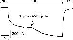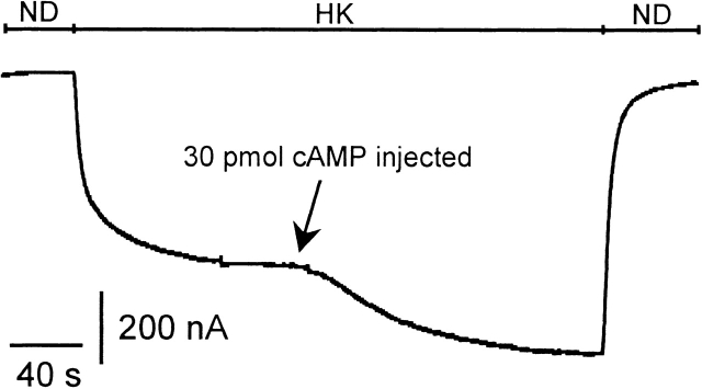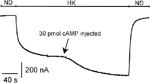 Figure 6. cAMP effects in the absence of heterologously coexpressed seven-helix receptors. Original current trace recorded at −80 mV derived from an oocyte expressing exclusively GIRK1/GIRK4 proteins. During HK superfusion, 50 pmol cAMP was injected.