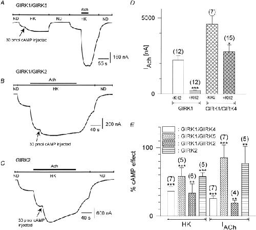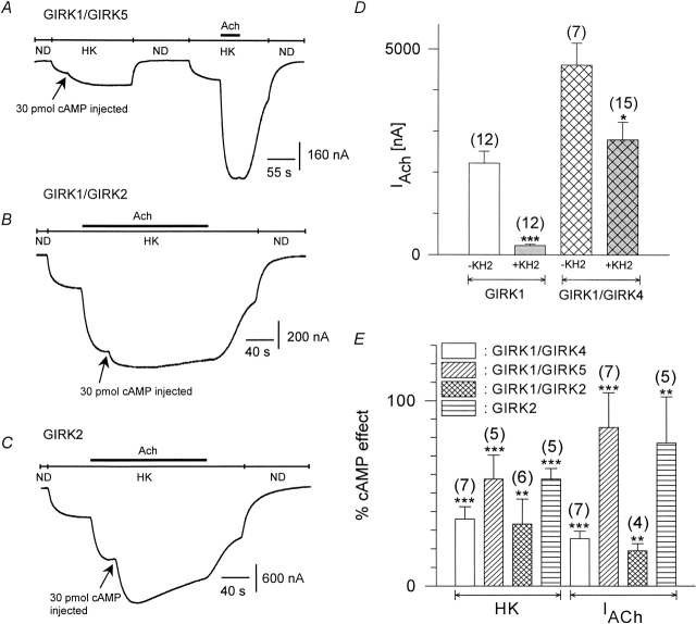 Figure 7. cAMP effects on GIRK isoforms. (A) Original current trace recorded at −80 mV from an oocyte expressing m2R and GIRK1. GIRK currents are therefore produced exclusively from the GIRK1/GIRK5 heterooligomeric assembly. cAMP was injected during basal HK current. (B) Current trace recorded from an oocyte expressing GIRK1/GIRK2 channels (endogenous GIRK5 was knocked out with the KHA2 antisense oligonucleotide). cAMP was injected during ACh superfusion. (C) Same as in B, but the oocyte expressed homooligomeric GIRK2 channels. (D) Effect of antisense oligonucleotide (KHA2) coinjected with either GIRK1 or GIRK1/GIRK4 cRNA on IACh currents. Calculated average values ± SEM are shown; the number of individual cells is given in parenthesis. (* and ***) Mean value deviates significantly (P < 0.05 and 0.001) from the corresponding control group (KHA2 not coinjected). (E) Statistics of cAMP effects on various GIRK subunit combinations on basal IHK currents as well as on agonist-induced currents (IACh). Calculated average values ± standard error of the effect normalized to basal IHK produced by the GIRK1/GIRK4 combination of a given experimental day are shown; the number of individual oocytes are in parenthesis. (** and ***) Mean value of the experimental group deviates significantly (P < 0.01 and 0.001) from zero.