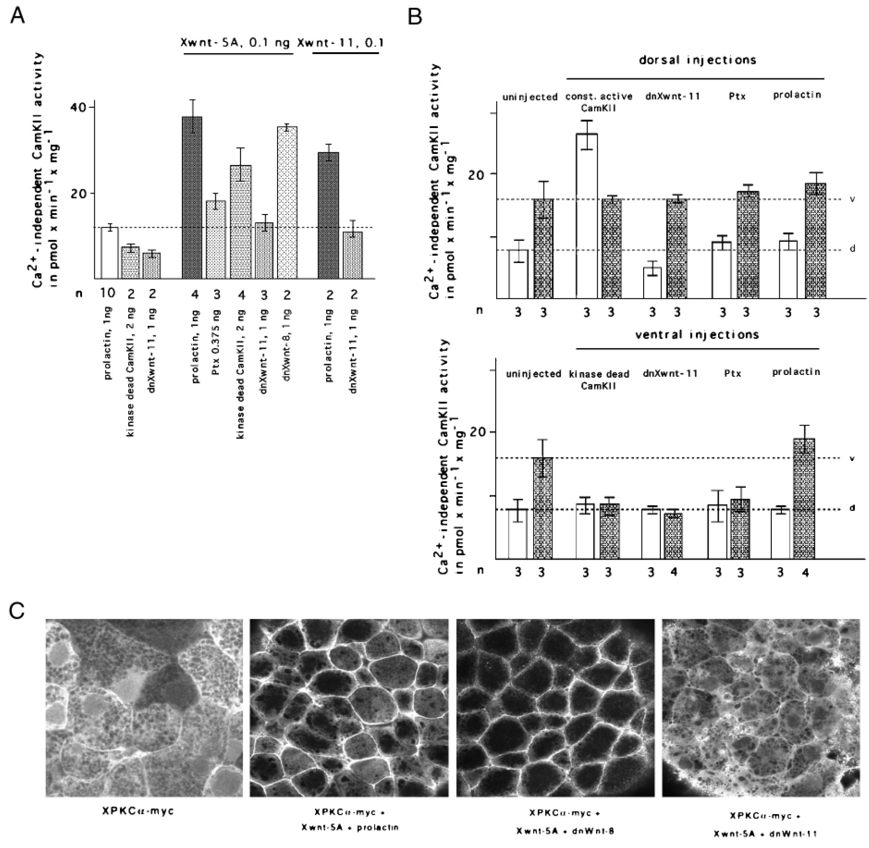 increase in CamKII activity (above dotted baseline) upon injection of Xwnt-5A is sensitive to pertussis toxin, kinase dead CamKII, and dnXwnt-11
