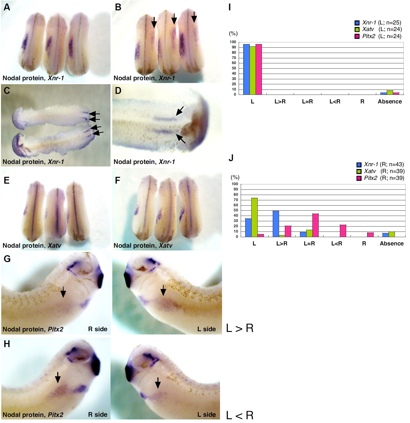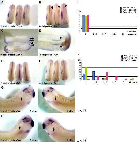 the other hand, after the right-side injection of Nodal, both Xnr-1 and pitx2 were induced in the right LPM (Xnr-1, 58%, n=25/43; pitx2, 87%, n=34/39),