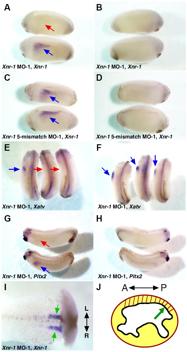 in G shows the left-right reversal of the heart. (H) Dorsal view of a stage 42embryo after injecting with 5nl of 1mM Xnr-1 MO-1 into each one of the two