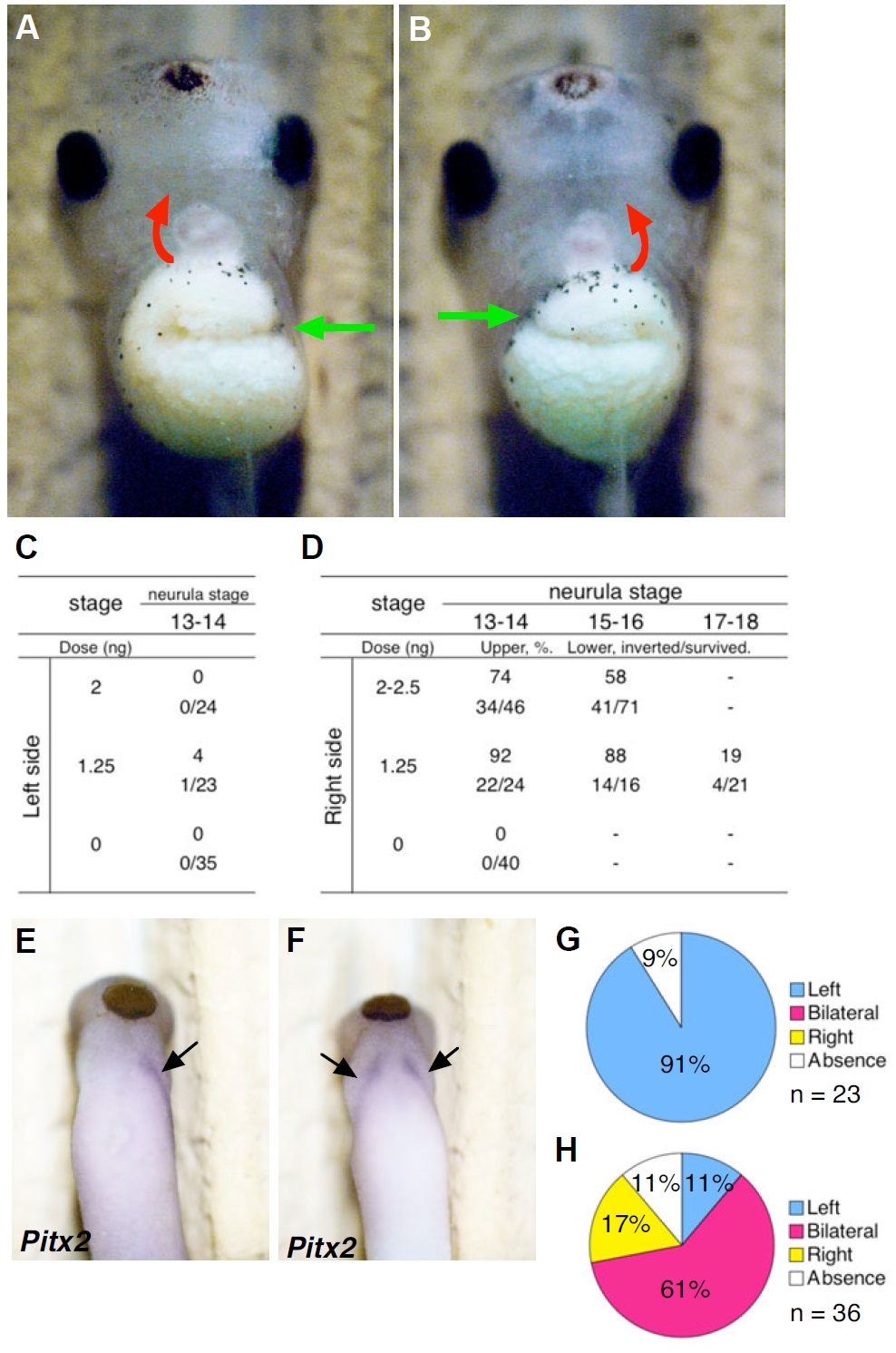 1 MO-2 (1mM, 10nl) into the ventral right (F) or ventralleft (G) blastomere at the 4-cell stage. The embryo in (F) shows normal situs, while the embryo