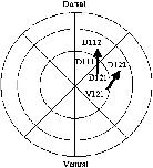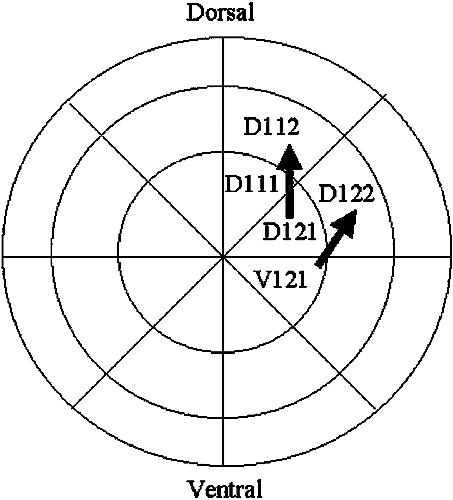 Diagram of the animal pole view of a 32-cell embryo. The five ipsilateral blastomeres that give rise to the retina are labeled with the Jacobson and Hirose (1981) nomenclature.Arrows demonstrate the blastomere transplantations that were performed: V1.2.1 to the position of D1.2.2 and D1.2.1 to the position of D1.1.2.
