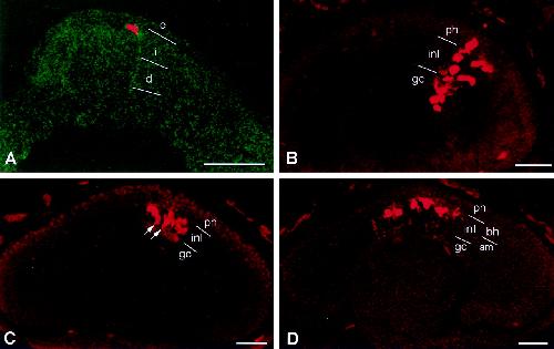 Clones resulting from the intracellular labeling of single cells at neural plate stages. A, An embryo fixed 10 min after labeling. Only a single cell was injected with tracer (red). This sagittal section demonstrates that in the region of the eye field, the neural plate is approximately four to six cells thick and can be divided into an intermediate zone (i) and a deep zone (d). The superficial zone is comprised of non-neural ectoderm (e). B, A section through the stage 44retina demonstrating a radial clone (red column) containing cells in each retinal layer. This clone also contains a few dispersed cells, a configuration only observed in 3.3% of cases and consistent with reports in chick and mouse (Fekete et al., 1994; Reese and Tan, 1998). C, A layered clone that resides entirely in the INL. It contains cells in the outer sublamina and amacrine cells (arrows) in the inner sublamina. D, A layered clone that resides entirely in the outer sublamina of the INL. am, Inner sublamina of the INL; bh, outer sublamina of the INL;gc, ganglion cell layer; inl, inner nuclear layer; ph, photoreceptor layer. Scale bars, 100 μm.