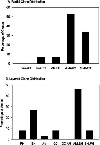The distribution of cells in clones descended from neural plate progenitors. A, The percentage of radial clones containing progeny in two nonadjacent layers (GC,BH; GC,PH; AM,PH), in three layers, or in four layers. B, The percentage of layered clones containing progeny in single layers (left side) or two adjacent layers (right side). In both categories, layered clones are found predominantly in the inner nuclear layer (BH; AM; AM,BH).