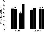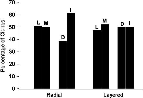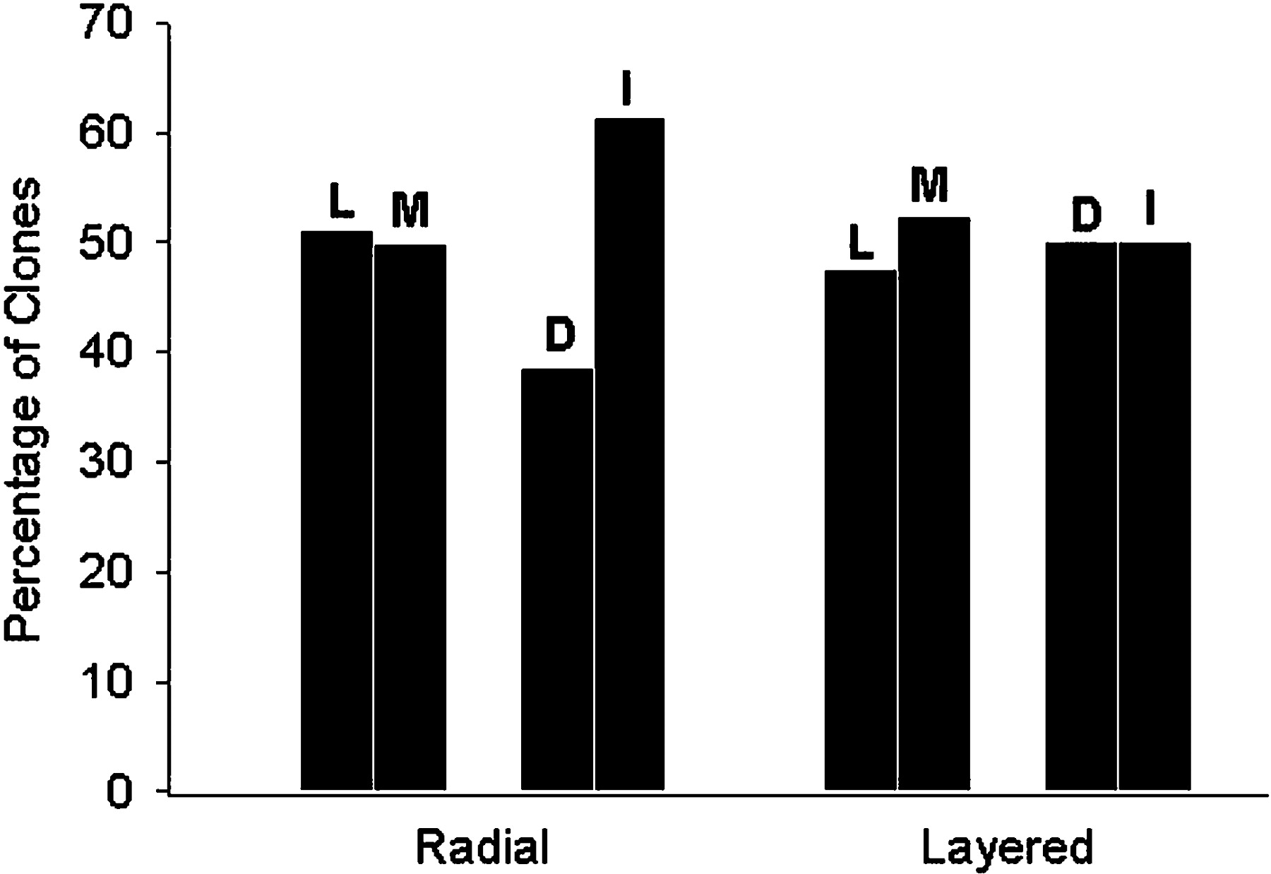 The spatial distribution of eye field progenitors that give rise to radial and layered clones. Both radial and layered progenitors are equally distributed between lateral (L) and medial (M) regions of the eye field. Radial progenitors are found slightly more frequently in intermediate (I, <40 μm) versus deep (D, >40 μm) cell layers, whereas layered progenitors are equally distributed throughout the depth of the neural plate.