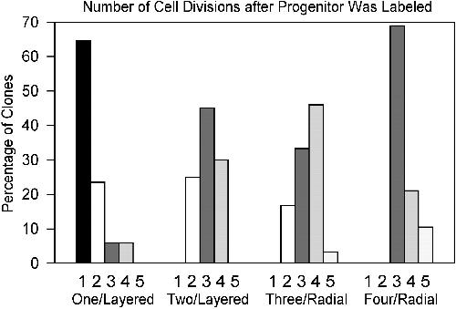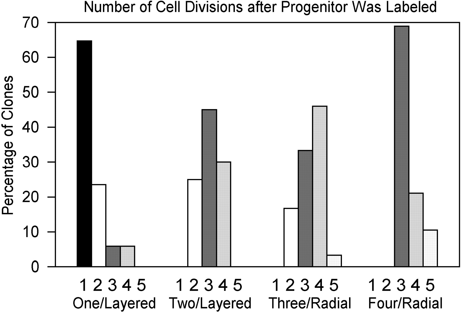 Layered clone progenitors divide fewer times than do radial clone progenitors. The number of cell divisions that occurred after a neural plate progenitor was labeled was determined by the size of the clone. The percentage of clones in each size bin (1–5 cell divisions) is shown for layered clones confined to one layer (One/Layered), layered clones confined to two adjacent layers (Two/Layered), radial clones distributed to three layers (Three/Radial), and radial clones distributed to four layers (Four/Radial).