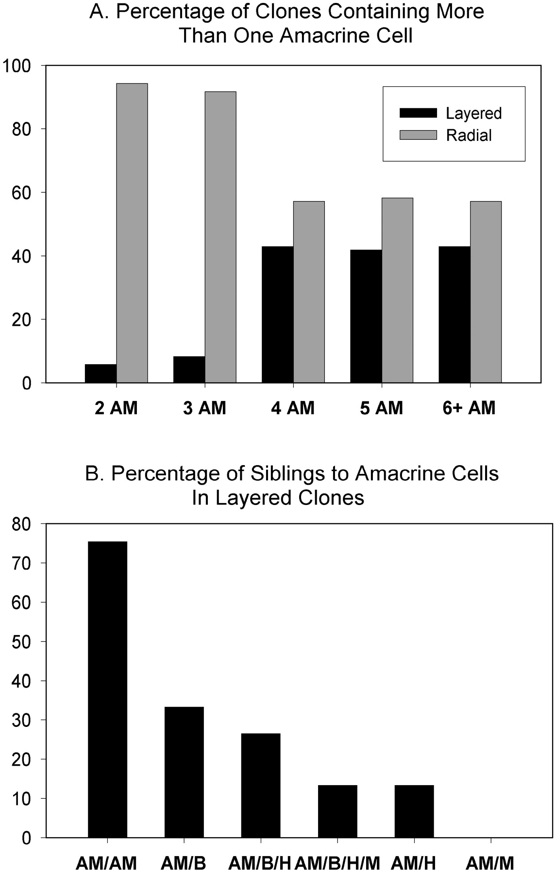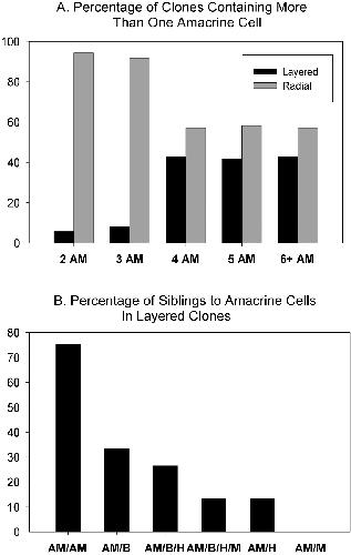 Layered clones are enriched in amacrine cells.A, Clones derived from eye field progenitors that contained more than one amacrine cell (AM) were analyzed as either radial (gray bars) or layered (black bars). The majority of clones containing small numbers of amacrine cells were radial, whereas nearly one-half of the clones containing large numbers of amacrine cells were layered.B, In layered clones, amacrine cells most frequently were siblings of other amacrine cells. They also were commonly siblings of bipolar cells (B), either alone or in common with horizontal (H) and Müller (M) cells. Rarely were amacrine cells only siblings of horizontal cells, and never were they siblings of only Müller cells.
