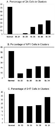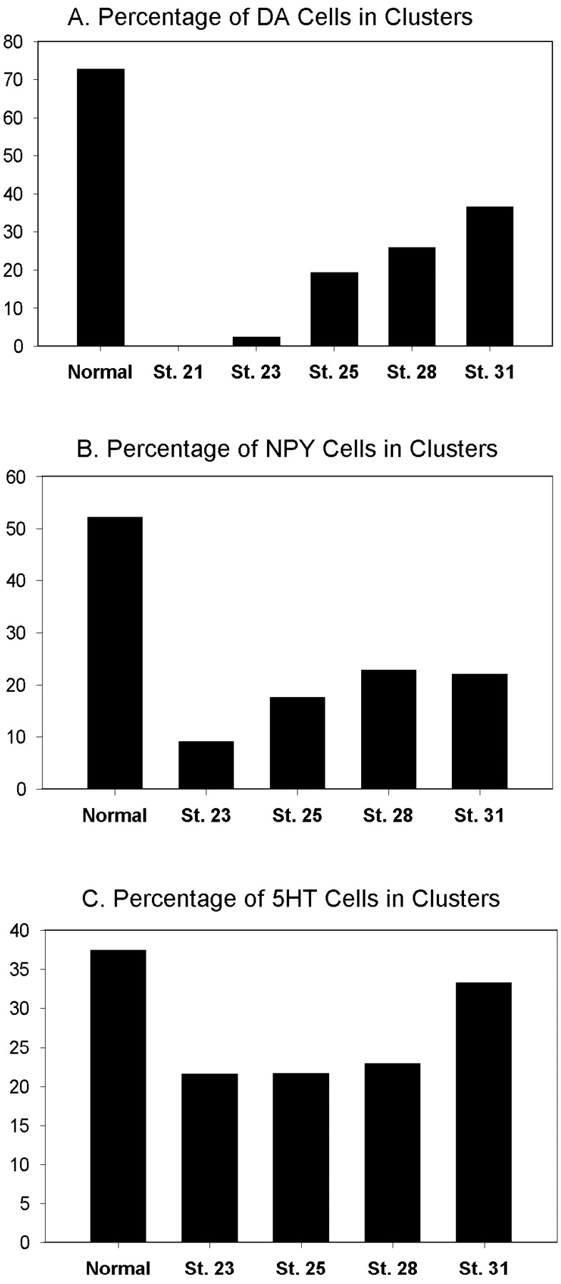 Formation of DA and NPY amacrine clusters is inhibited when mitosis is repressed during optic vesicle stages.A, The percentage of DA amacrine cells found in clusters is completely inhibited when embryos are incubated in DNA replication inhibitors starting at stage 21. The percentage of clusters remains significantly repressed during optic vesicle stages (23–25) and gradually returns to nearly 50% of the normal level by optic cup stages (31). B, The percentage of NPY amacrine cells found in clusters is significantly repressed during optic vesicle stages (23–25) and returns to nearly 50% of the normal level by optic cup stages (31). C, The percentage of LB-5-HT amacrine cells found in clusters is reduced to slightly >50% during optic vesicle stages and returns to near normal by optic cup stages.St., Stage.