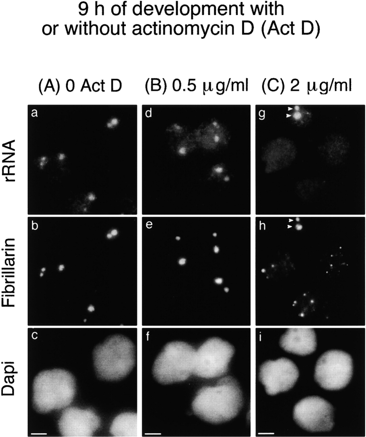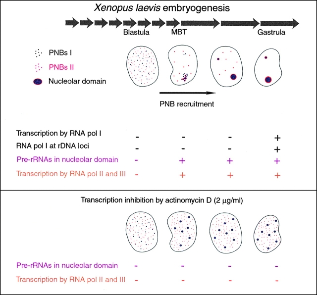 Transcription and splicing of messenger RNAs are temporally and spatially coordinated through the recruitment by RNA polymerase II of processing factors. We questioned whether RNA polymerase I plays a role in the recruitment of the ribosomal RNA (rRNA) processing machinery. During Xenopus laevis embryogenesis, recruitment of the rRNA processing machinery to the nucleolar domain occurs in two steps: two types of precursor structures called prenucleolar bodies (PNBs) form independently throughout the nucleoplasm; and components of PNBs I (fibrillarin, nucleolin, and the U3 and U8 small nucleolar RNAs) fuse to the nucleolar domain before components of PNBs II (B23/NO38). This fusion process is independent of RNA polymerase I activity, as shown by actinomycin D treatment of embryos and by the lack of detectable RNA polymerase I at ribosomal gene loci during fusion. Instead, this process is concomitant with the targeting of maternally derived pre-rRNAs to the nucleolar domain. Absence of fusion was correlated with absence of these pre-rRNAs in nuclei where RNA polymerase II and III are inhibited. Therefore, during X. laevis embryogenesis, the recruitment of the rRNA processing machinery to the nucleolar domain could be dependent on the presence of pre-rRNAs, but is independent of either zygotic RNA polymerase I transcription or the presence of RNA polymerase I itself.