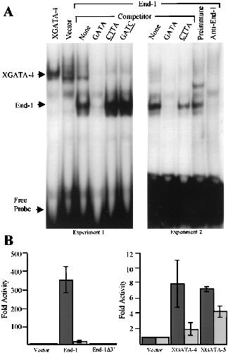 END-1 is a sequence-specific DNA-binding protein and transcriptional activator. (A) Electrophoretic mobility shift assay with a radiolabeled GATA probe and nuclear extracts from COS cells transfected with XGATA-4 or END-1 cDNA. Cold competitor oligonucleotides (100× excess) either had the same sequence as the probe (GATA) or replacement of this sequence by GATC or CTTA. In the last two lanes, reactions included preimmune or End-1-specific rabbit antiserum. (B) Fold activation of the GATA-driven luciferase reporter construct αD3 (black bars) or the mutant reporter construct αD4 (in which the GATA site in the promoter is replaced by CTGA; gray bars) after transfection of plasmids encoding END-1, END-1Δ3′, XGATA-4, or XGATA-5.