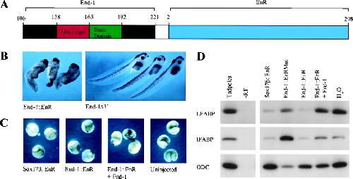 A dominant inhibitory GATA-binding protein represses endoderm development in Xenopus embryos. (A) Design of the dominant-inhibitory construct End-1â·EnR fusing the putative DNA-binding domain of END-1 (aa 106â221) to the transcriptional repression domain (aa 2â298) of Drosophila Engrailed. (B) Phenotype of Xenopus embryos at stage 42/43 after microinjection of 100 pg of End-1â·EnR or control (End-1δ3â²) mRNA into the vegetal hemisphere at the one-cell stage. (C) Rescue of lethal developmental effects of vegetal expression of End-1â·EnR by coinjection of wild-type End-1. Two-cell embryos were injected in the vegetal hemisphere of each blastomere with 400 pg of Sox17βâ·EnR or End-1â·EnR mRNA, and 400 pg of either End-1 (panel 3) or End-1δ3â² (panels 1 and 2) mRNA. (D) Down-regulation of mature markers of Xenopus endoderm in vegetal explants treated with End-1â·EnR. Two-cell embryos were injected as above with 250 pg of Sox17βâ·EnR or End-1â·EnR mRNA and 250 pg of End-1 (lane 6) or End-1δ3â² (lanes 3â5) mRNA. Vegetal explants were cultured until the equivalent of Stage 35. RT-PCR for ODC serves as a control for equal RNA input.