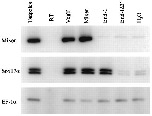 GATA activity functions early in vertebrate endoderm development. One-cell Xenopus embryos were injected with 250 pg of mRNA, animal cap explants were cultured until sister tadpoles reached Stage 11.5, and RNA was analyzed by RT-PCR for the early endoderm markers Mixer and XSox17α and for EF-1α.