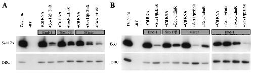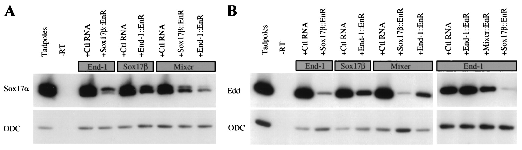Placing GATA activity within the context of Mixer/Mix.3 and Sox17 functions in Xenopus endoderm development. One-cell embryos were injected with 200 pg of endoderm-inducing mRNAs, and 400 pg of either mRNA-encoding dominant-inhibitory EnR fusion proteins or EF-1α âfillerâ mRNA. Animal cap explants were cultured and RNA analyzed by RT-PCR for Sox17α when sister tadpoles reached Nieuwkoop-Faber Stage 15 (A), for endodermin (Edd) at the equivalent of Stage 40 (B), and for ODC as a loading control.