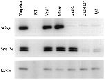 Induction of endoderm in Xenopus ectodermal explants by GATA proteins. Embryos were injected with 250â500 pg of mRNA into the animal pole, and animal cap explants were cultured until sister tadpoles reached Stage 40. RNA was analyzed by RT-PCR (A, C, and D) or whole-mount in situ hybridization (B and E) for endodermin (Edd), IFABP, LFABP, Sox17α, XlHbox8, brachyury (Xbra), and Xtwist. Equal input of RNA samples was established by RT-PCR for elongation factor (EF)-1α or ODC. A low background of endodermin and Xsox17α is occasionally observed in controls.