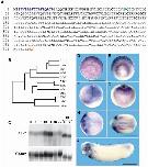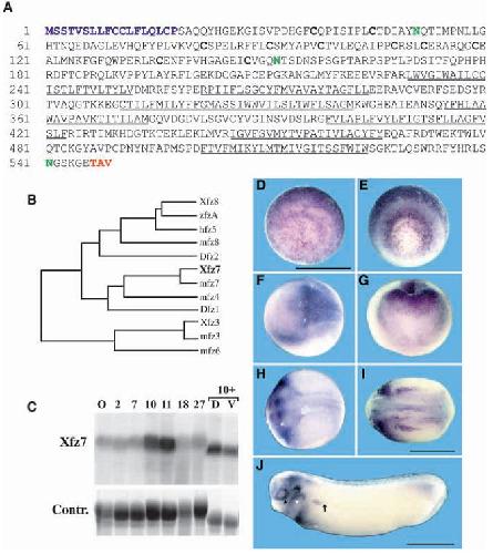 Fig. 1. Xenopus laevis frizzled 7 (Xfz7) sequence and expression in embryonic development. (A) Deduced Xfz7 protein sequence. The amino-terminal signal sequence is shown in purple, conserved cysteines are in bold, and the putative PDZ-binding motif is in red. Consensus N-linked glycosylation sites are in green, and the putative transmembrane domains are underlined. (B) Estimated evolutionary relationship of Xfz7 with other known frizzled proteins. Proteins displaying the greatest