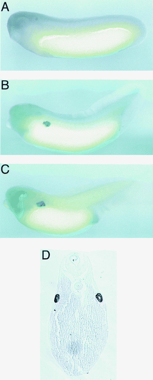 The first step in kidney development is the formation of the pronephros which is derived from mesoderm. Xenopus is an appropriate model to study this process since the pronephros can be efficiently induced in animal cap explants by treatment with activin and retinoic acid (RA). Using this in vitro system, we isolated a Xenopus homologue of SMP-30 (Senescence marker protein-30), which is a Ca(2+)-binding protein that is highly conserved in vertebrates. This gene, termed XSMP-30, was found to be selectively expressed in pronephric tubules from the late tadpole stage, by whole mount in situ hybridization. Furthermore XSMP-30 was expressed in animal caps treated with both activin and RA, a condition in which the pronephros is formed in vitro. These data indicate that XSMP-30 is a specific marker for the pronephros.