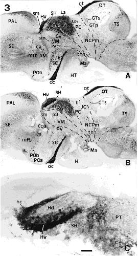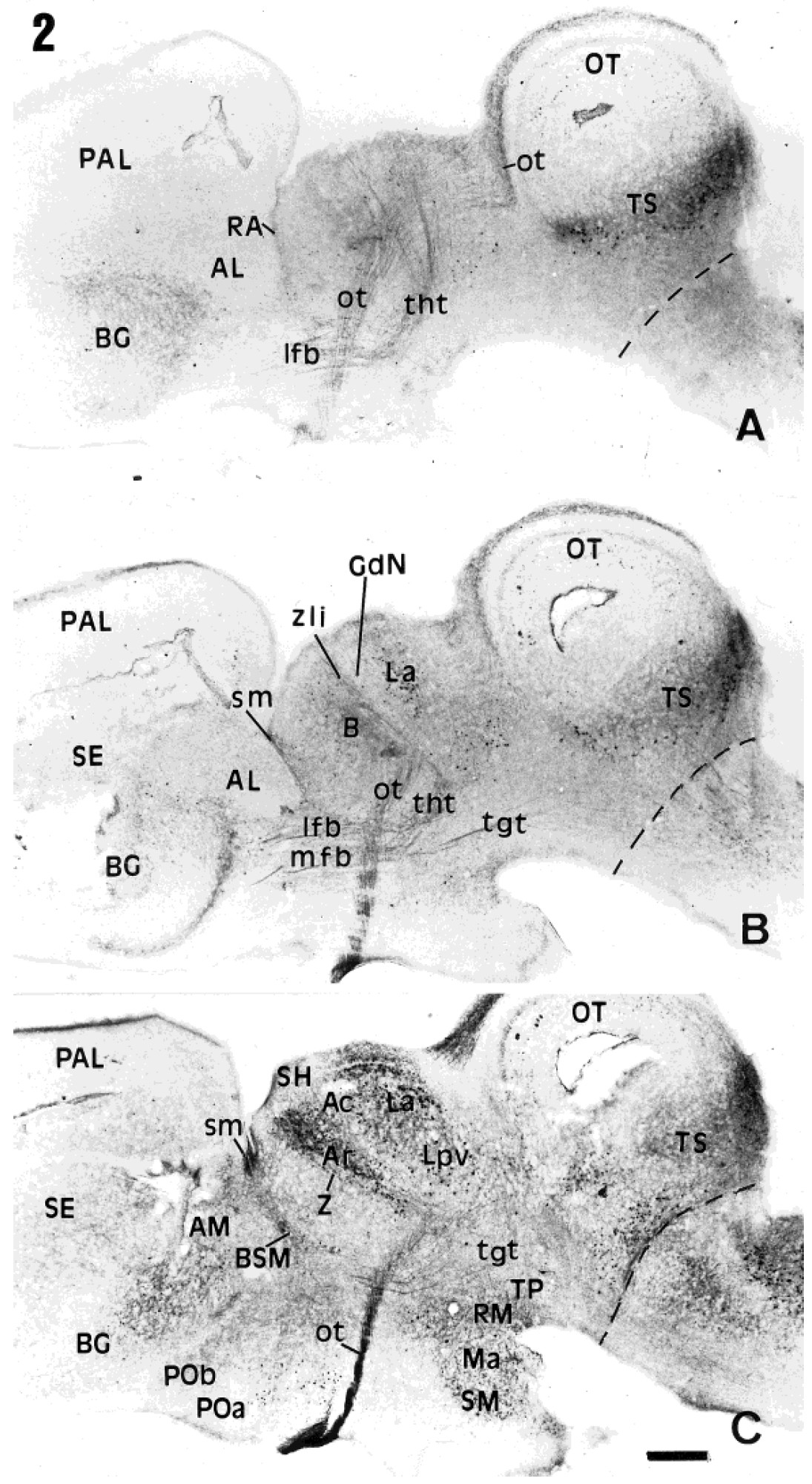 forebrain bundle in the secondary prosencephalon (best seen in A and