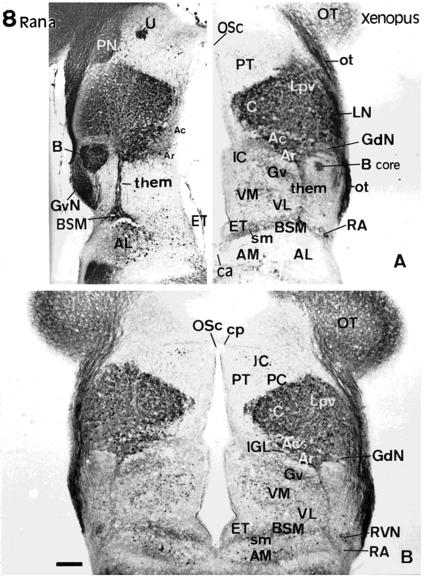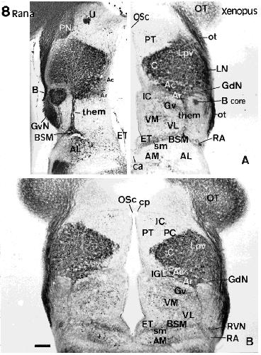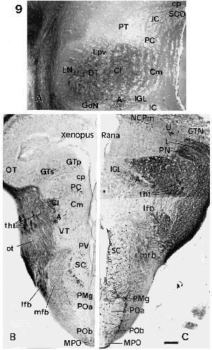the caudal poles of the telencephalon. B: Rana/Xenopus (corresponding