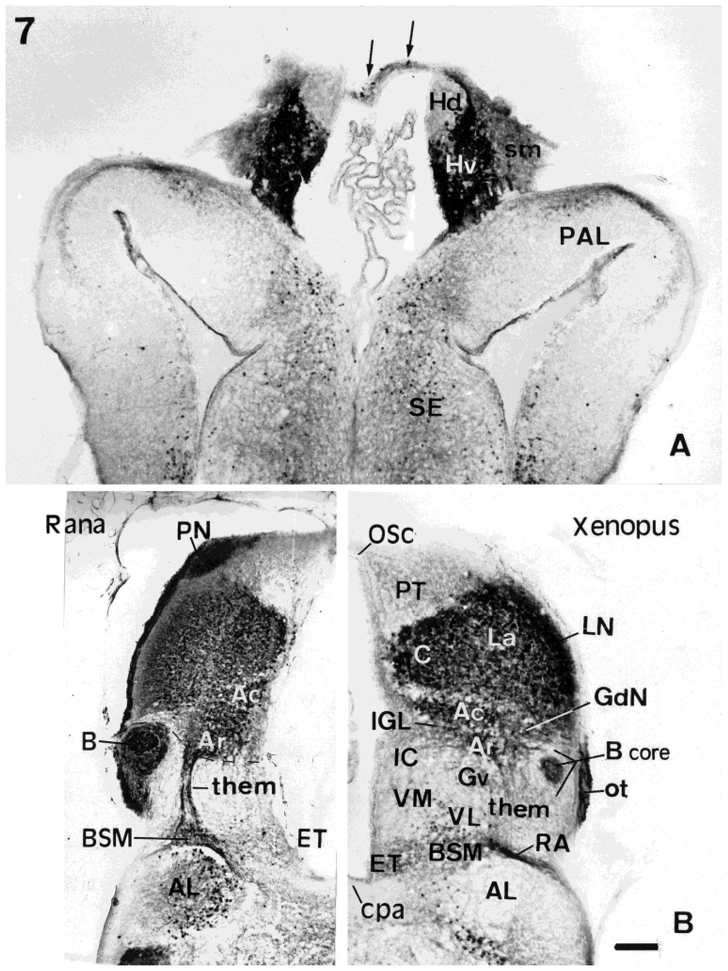 Fig. 7. Horizontal sections of Xenopus or Rana brains immunoreacted