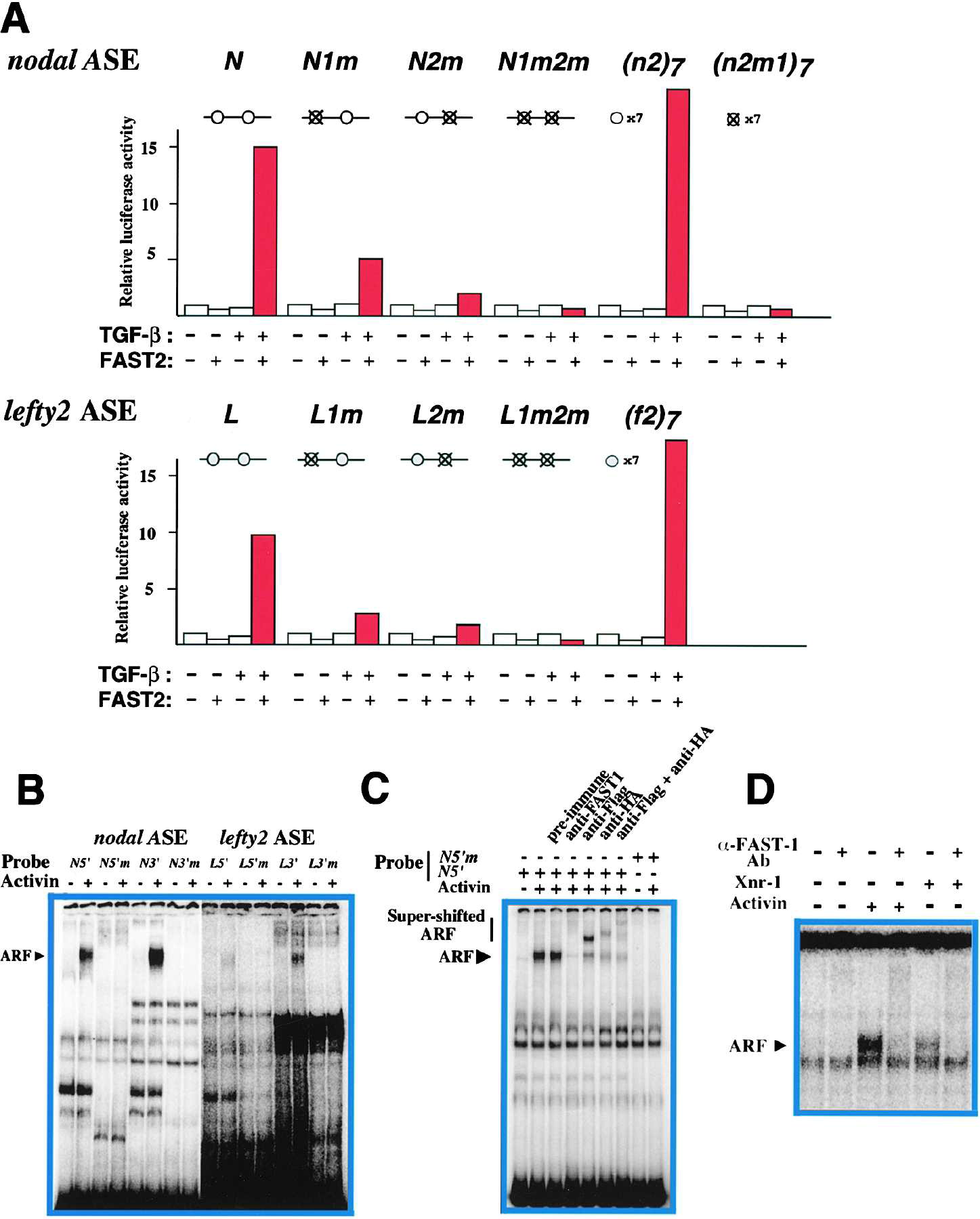 (C) Supershift analysis of ARF binding to the N5′ wild-type fragment of nodal ASE. Supershift assays were performed with N5′ as probe and with extracts of Xenopus embryos that had been injected with RNAs encoding Flag epitope–tagged Smad2 and HA epitope–tagged Smad4, in the absence or presence of RNA encoding activin B. The effects of preimmune serum, antibodies to FAST-1, and monoclonal antibodies to either the Flag or HA epitopes on the electrophoretic mobility of the DNA–protein complex are indicated. EMSA analysis was also performed with N5′m as probe as a control.
