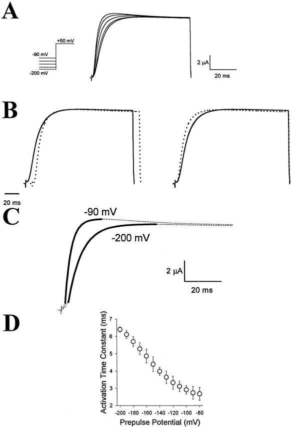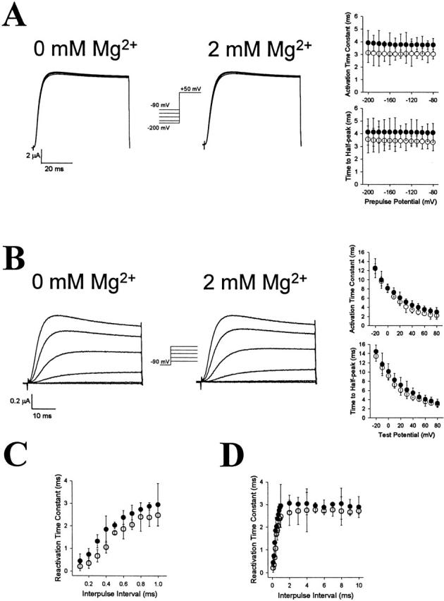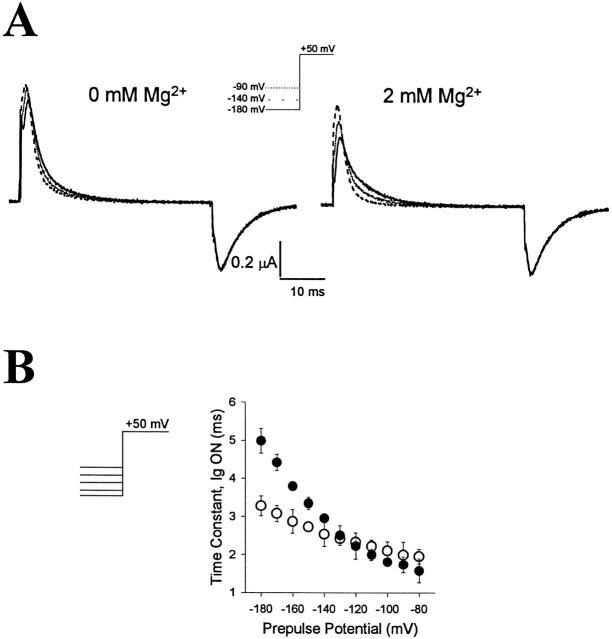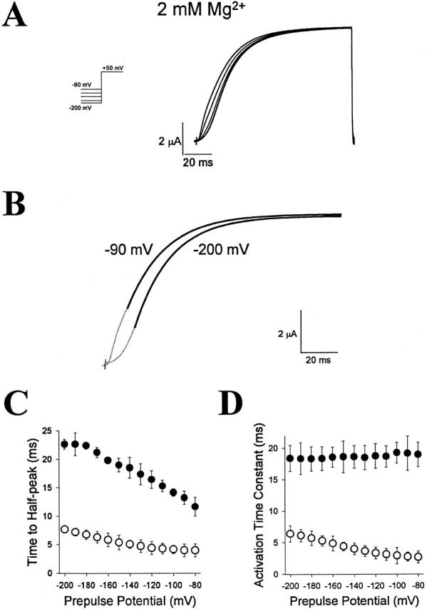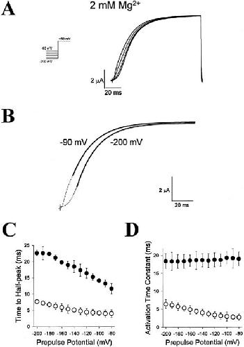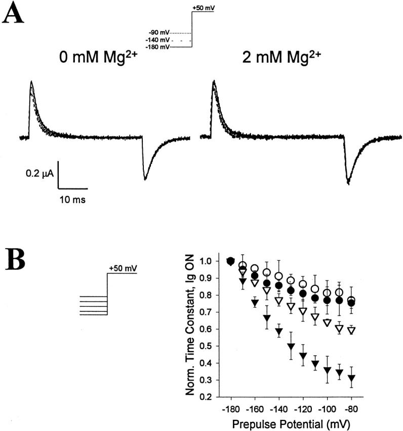 We have characterized the effects of prepulse hyperpolarization and extracellular Mg(2+) on the ionic and gating currents of the Drosophila ether-à-go-go K(+) channel (eag). Hyperpolarizing prepulses significantly slowed channel opening elicited by a subsequent depolarization, revealing rate-limiting transitions for activation of the ionic currents. Extracellular Mg(2+) dramatically slowed activation of eag ionic currents evoked with or without prepulse hyperpolarization and regulated the kinetics of channel opening from a nearby closed state(s). These results suggest that Mg(2+) modulates voltage-dependent gating and pore opening in eag channels. To investigate the mechanism of this modulation, eag gating currents were recorded using the cut-open oocyte voltage clamp. Prepulse hyperpolarization and extracellular Mg(2+) slowed the time course of ON gating currents. These kinetic changes resembled the results at the ionic current level, but were much smaller in magnitude, suggesting that prepulse hyperpolarization and Mg(2+) modulate gating transitions that occur slowly and/or move relatively little gating charge. To determine whether quantitatively different effects on ionic and gating currents could be obtained from a sequential activation pathway, computer simulations were performed. Simulations using a sequential model for activation reproduced the key features of eag ionic and gating currents and their modulation by prepulse hyperpolarization and extracellular Mg(2+). We have also identified mutations in the S3-S4 loop that modify or eliminate the regulation of eag gating by prepulse hyperpolarization and Mg(2+), indicating an important role for this region in the voltage-dependent activation of eag.