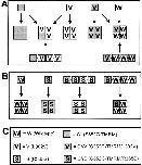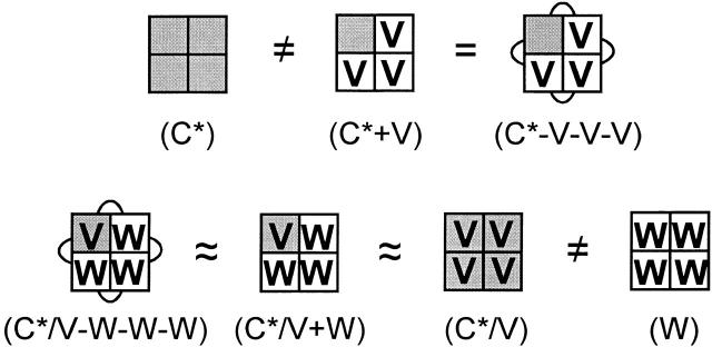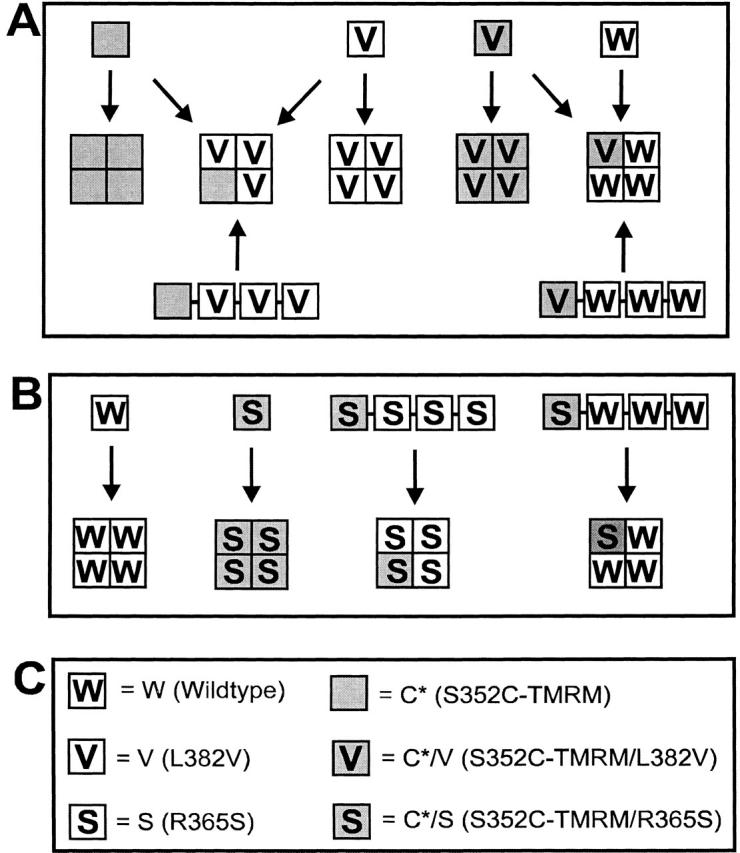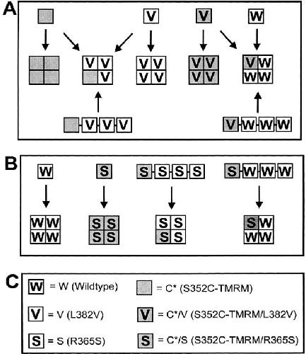 Figure 1. Subunit stoichiometry in heterotetrameric channels. Cartoon shows expected subunit arrangement of labeled (shaded) and unlabeled (unshaded) subunits that have either wild-type (blank) or voltage-shifted (V and S) S4 gating. The identity of each subunit shown in A and B, and the corresponding abbreviations used in this paper, are shown in C. (A) Homo- and heterotetrameric channels (middle) expressed in the experiments involving the L382V mutant (V). Heterotetrameric channels with one labeled subunit were favored in coinjection of pairs of cRNAs encoding labelable and unlabelable subunits (e.g., C* + V) (top), or defined by injection of a single cRNA encoding four linked subunits (bottom). (B) Subunit stoichiometry in the experiments involving expression of the R365S mutant (S). For expression of heterotetrameric channels, subunits were covalently linked in all experiments to constrain their stoichiometry.