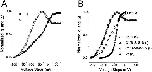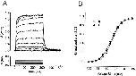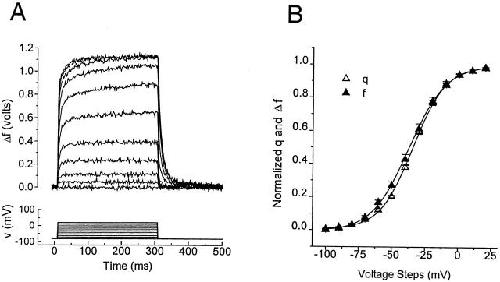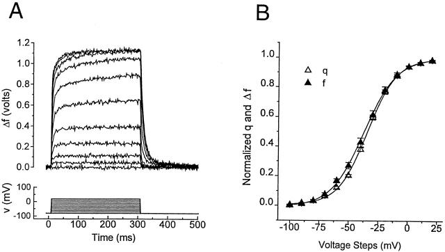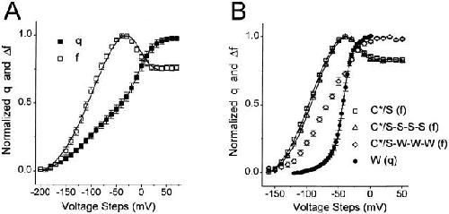 Figure 3. Voltage-dependent gating charge movement (Q) and fluorescence change (F) of TMRM-labeled S352C (C*). (A) Fluorescence recording (top) during voltage steps (bottom) from a holding potential of −80 to +20 mV in 10-mV increments. Each fluorescence trace is the average of five sweeps. (B) Normalized q-v (▴) and f-v (▵) relations show a tight correlation, indicating that the f-v is a good indicator of the activation state of a C* subunit's S4. Solid lines represent the fit of the data points to a Boltzmann function (q:v = −34.6 ± 1.8 mV, z = 2.26 ± 0.05; f:v = −31.3 ± 2.26 mV, z = 2.21 ± 0.12, n = 12). Note that only fluorescence increase is seen across the measured voltage range.