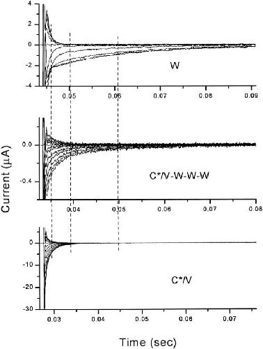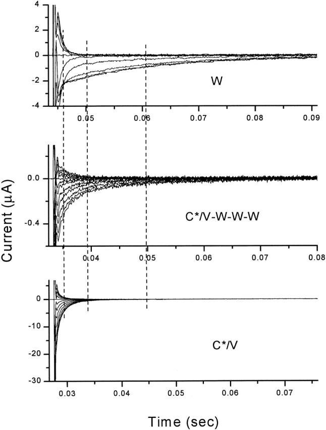 Figure 5. Off-gating currents recorded from oocytes expressing either wild type (W, top), labeled double mutant 352C/382V (C*/V, bottom), or linked heterotetramer C*/V-W-W-W (middle) channels. The gating currents were evoked by steps from −80 mV to voltages ranging from −100 to 0 mV in 10- mV increments, followed by repolarization to −60 mV. Vertical dashed lines correspond to the time constant of the slower component from a two-exponential fit of the off-gating current following the step to −20 mV (left dashed line = C*/V's time constant = 1.7 ms; middle dashed line = C*/V-W-W-W time constant = 6.0 ms; right dashed line = W time constant = 16.0 ms).