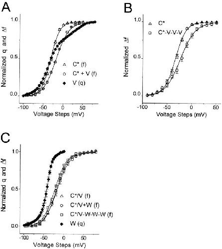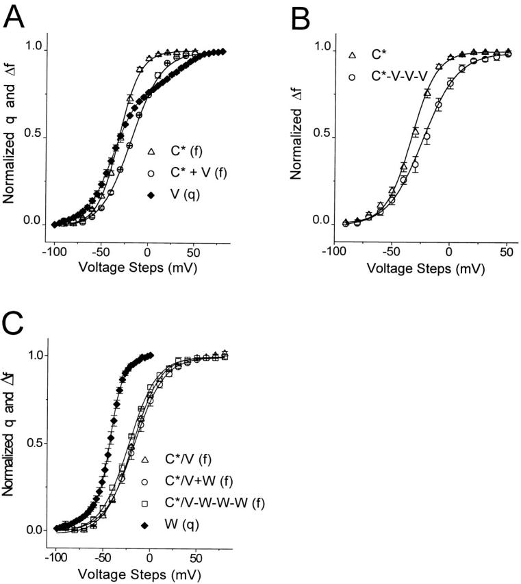 Figure 4. Cooperativity in wild-type S4 movement. (A) Normalized f-v from channels expressed in oocytes injected with cRNA encoding S352C (C*, ▵), or coinjected with a 1.5:8.5 ratio of S352C:L382V cRNA (C*+V, ○), and the normalized q-v of L382V channels (V, ♦). The presence of a majority of V subunits produces a rightward shift in the C* subunit f-v toward the even further rightward-shifted depolarized component of the V subunit q-v. Note the absence of a leftward shift toward the V subunit q-v at the foot of the C* f-v. Solid lines represent the fit of the data points to a single Boltzmann (C*+V: V = −18.8 ± 0.9 mV, z = 1.54 ± 0.05, n = 6) or to the sum of two Boltzmann functions (V: v1 = −42.6 ± 1.9, z1 = 1.84 ± 0.04, v2 = +33.0 ± 2.0, z2 = 1.38 ± 0.23, n = 5). (B) Normalized f-v of S352C (C*, ▵) and of the linked tetramer S352C-L382V-L382V-L382V (C*-V-V-V, ○: V = −20.6 ± 2.4 mV, z = 1.74 ± 0.11, n = 11). The linked heterotetramer with only one labelable subunit closely resembles the coinjection (A) that favors channels with zero or one labelable subunit, of which only the latter contribute to the fluorescence signal. (C) S4 gating of the labeled double-mutant S352C-TMRM/L382V (C*/V, ▵) is not changed by coassembly with three wild-type subunits (W, ♦), as shown by the comparison of the normalized f-v of the homotetramer C*/V to that of the heterotetramer with a 1:3 ratio of C*/V to W subunits (obtained by coinjection of C*/V and W cRNA in a 1:8.5 ratio (C*/V + W in the figure, ○) or by injection of the C*/V-W-W-W–linked cRNA, □). (C*/V: v = −18.8 ± 0.8, z = 1.70 ± 0.07; C*/V + W: v = −16.7 ± 4.2, z = 1.62 ± 0.07; C*/V-W-W-W: v = −22.9 ± 1.0, z = 1.68 ± 0.16, n = 5). The normalized q-v of the unlabeled wild type is also shown (W; see Table for the results of the Boltzmann relation fit).