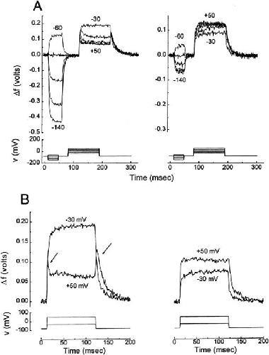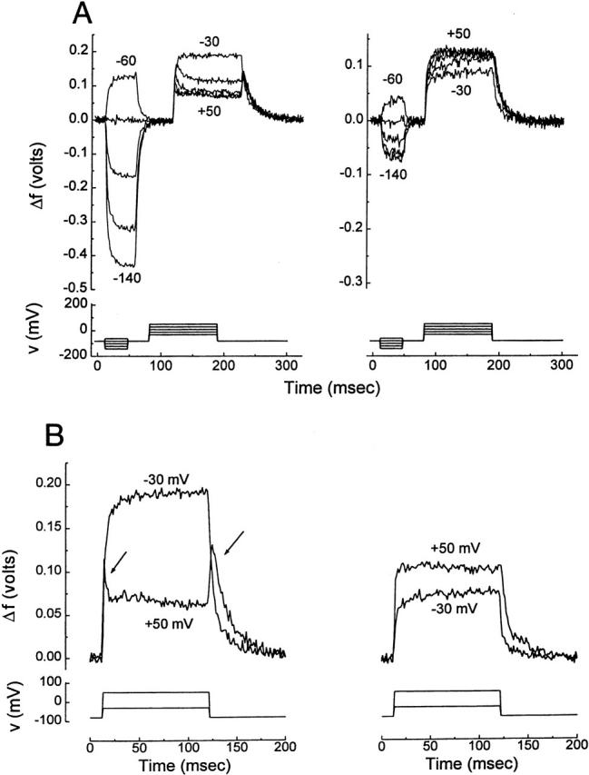 Figure 8. Fluorescence changes of the linked tetramers C*/S-S-S-S (left) and C*/S-W-W-W (right). (A) Fluorescence changes in a double-pulse experiment (five episodes, each composed of five epochs, sequentially in mV: −80/−140/−80/−30/−80, with 20-mV increments of the second and fourth epochs). Note that, for both channels, only a single component is present from very negative voltages up until −30 mV. With further depolarization, only C*/S-S-S-S (left) shows two kinetic components both in the “on” and in the off fluorescence: an upward transient, which rapidly decays to a steady state level. These components are the kinetic expressions of S4's three gating states (resting, intermediate, and activated), which are well separated in their voltage dependence by the mutation R365S. As a result of the cooperative interaction in q2, coassembly of one C*/S subunit with three W subunits restores the direction of the f2 fluorescence change to that of C* (compare right with Fig. 3 A). (B) Fluorescence changes in response to voltage steps from −80 to −30 and +50 mV. Arrows points to the on and off transients shown by C*/S-S-S-S, but absent in C*/S-W-W-W, as they are in wild type (Fig. 3 A).
