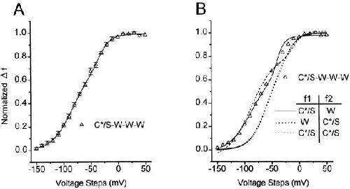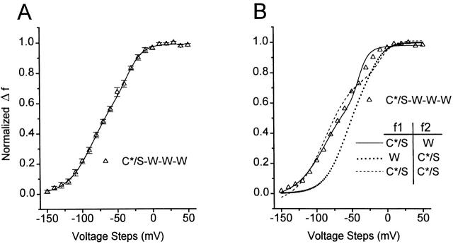 Figure 9. The single C*/S subunit S4 moves independently in q1, but is strongly influenced by the three W subunits in q2. (A) Free fit of the C*/S-W-W-W's f-v to the sum of two Boltzmann functions (solid line). See Table for estimates of the voltage parameters. (B) The f-v of C*/S-W-W-W is closely approached by a constrained fit using the f1 voltage parameters of C*/S and the q2 voltage parameters of W (solid line), but not by constrained fits with the q1 of W and f2 of C*/S (dotted line), or the f1 and f2 of C*/S-S-S-S, with f2 polarity inverted (dashed line). Note that the foot of the heterotetramer's f-v does not show the shift toward more depolarized potentials expected for subunit interactions in q1 (dotted line).