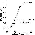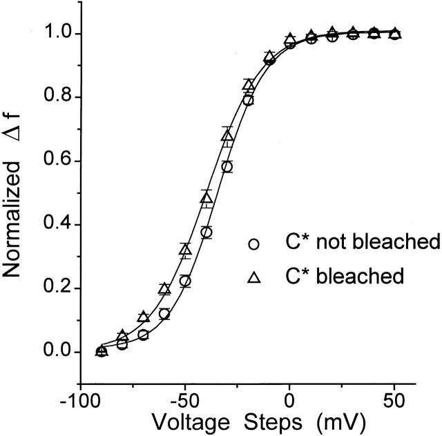 Figure 2. Dependence of fluorescence on the number of labeled subunits. Possible interactions between fluorophore bound to neighboring subunits does not distort the fluorescence of 352C-TMRM (C*), since the f-v of 352C channels labeled to saturation is very little affected by bleaching to a degree that decreases Δf by 80%. Solid lines represent fit of the data points to a Boltzmann function: y = B/{1 + exp[−z (x − v)/25]}. C* not bleached: V = −34.7 ± 0.9, z = 2.17 ± 0.09. C* bleached: v = −39.6 ± 1.5, z = 1.95 ± 0.05. n = 10 for both.