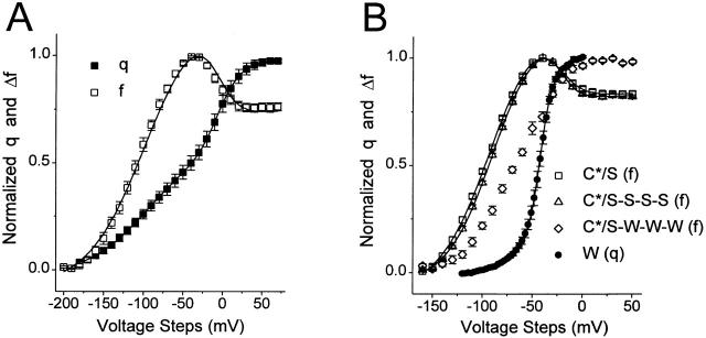 Figure 7. Subunit interaction in the C*/S-W-W-W heterotetramer. (A) Both the q-v (▪) and f-v (□) of S352C/R365S (C*/S) have two components. The estimates from the fit of the q-v to the sum of two Boltzmann functions (v1 = −94.0 ± 7.3 mV, z1 = 0.98 ± 0.05, v2 = −7.4 ± 2.5 mV, z2 = 2.46 ± 0.15, mean ± SEM, n = 6) well fits the f-v (solid line) when v1/2 and slope values are fixed, but the amplitudes and polarity of the two components are allowed to vary. This indicates that C* reports on both of S4's major outward activating movements. (B) Assembly of one C*/S subunit with three W subunits alters C*/S S4 movement. Graph includes f-v's of the linked tetramers C*/S-W-W-W (with C*/S = S352C-TMRM/R365S, and W = wild type; ⋄) and C*/S-S-S-S (with S = R365S; ▵), and of C*/S homotetramers (□), as well as the q-v of W homotetramers (•). See Table for the results of the Boltzmann relation fits.