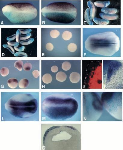 Fig. 1. XBF-1 induces neural tissue autonomously, at the expense of epidermis and in the absence of mesodermal signals. XBF-1 induces ectopic XSox3 even when cell division is blocked. Embryos were injected with a high dose of XBF-1 plus lacZ RNA or lacZ RNA alone (A or B respectively; light blue) and hybridised with a probe for epidermal keratin (dark magenta). Other embryos (C,D) were injected with XBF-1 plus lacZ RNA and were analysed at the tadpole stage for lacZ (C,D; light blue), N-tubulin (C) and muscle actin (D) expression (magenta). Note that ectopic N-tubulin expression is not accompanied by a corresponding expansion or ectopic expression of muscle actin. XBF-1 injected animal caps do not express collagen type II (E), which in the embryo is expressed in the somites and notochord (F). In contrast, XBF-1 injected (G), but not control uninjected (H), animal caps express XSox3. In this experiment, XBF-1 injected animal caps were combined with control RLDx labelled caps (E,G,H,J). Fluorescent (J) and bright-field (K) images of a sectioned animal cap demonstrate that XSox3 expression is localised in the XBF-1 injected part of the XBF-1/RLDx animal cap conjugate. Embryos (L,M) were injected with a high dose of XBF-1 and lacZ RNA and some of these were treated with HUA at the early gastrula stage (M). All embryos shown (L-N) are hybridised with XSox3. Embryos injected with lacZ and treated with HUA have normal XSox3 expression while both XBF-1 injected (L) and XBF-1 injected plus HUA (M) treated embryos show an expansion of the XSox3 expression domain. The expansion of the XSox-3 expressing domain in HUA- treated XBF-1 injected embryos can be clearly seen in section (O). HUA treated embryos (N, embryo on the right) have larger nuclei than sibling controls (N, embryo on the left) illustrating that cell division has been effectively blocked by the HUA treatment.