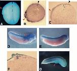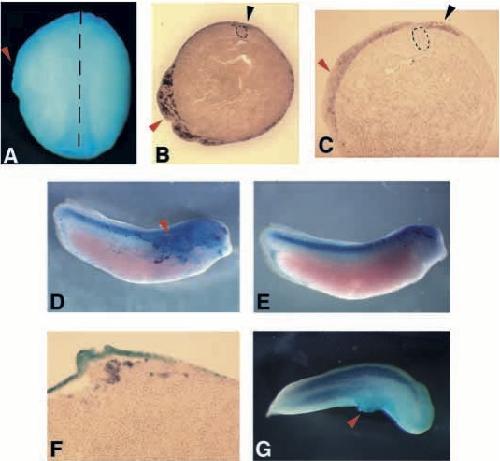 Fig. 2. XBF-1 induces tissue outgrowths in the ectoderm. In all panels, a red arrowhead indicates convoluted and/or thickened ectoderm on the side that has been injected with XBF-1 RNA (all panels except E and F) or DNA (F). Whole embryo (A) and transverse sections (B,C) of neurula embryos hybridised with N- tubulin (B) and XSox3 (C; C is also lightly stained for BrdU incorporation). Note the dramatic thickening of the ectopic neural tissue (red arrowhead) compared with the normal neural tissue on the control side (black arrowhead). The dotted line demarcates the dorsal midline (A) or the notochord (B,C), separating the injected (left) from the uninjected side. Tadpole stage embryos were hybridised with N-tubulin (D, the injected side; E, the control side; F, high magnification of a section through D) and muscle actin (G) (magenta staining in all). In G, note that there is no ectopic muscle actin expression in the lateral protrusion. In embryos shown in D-G, XBF-1 RNA or DNA was coinjected with lacZ RNA (light blue).
