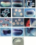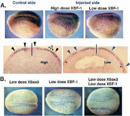 Fig. 4. XBF-1 affects BrdU incorporation in the ectoderm and co-operates with XSox3. (A) Embryos were injected with either a high or a low dose of XBF-1 RNA, as indicated, in one blastomere of the two-cell stage embryo and were processed for double whole-mount in situ hybridisation for XSox3 (blue/green) and N-tubulin (magenta), followed by BrdU incorporation (brown). Whole mounts and transverse section are shown. In the sections a black line indicates the dorsal midline, separating the injected (right) from the uninjected side (left). Black and blue arrowheads delimit the XSox3 and N-tubulin expression domains, respectively. In the high-dose sections, arrows show an area of increased BrdU incorporation on the injected side. In the low-dose sections, an asterisk on the injected side (right) shows an area of the ectoderm where dividing cells should have been located, when compared with the equivalent region of the control side (asterisk on control side, left). Also note that in the control side N-tubulin positive cells are located within a wider area of BrdU negative cells while in the experimental side N- tubulin positive and BrdU positive cells are intermingled. (B) Embryos were injected with either low-dose XSox3, low- dose XBF-1, or both, and processed for N-tubulin (purple) and BrdU incorporation (brown). A low dose of XSox3 did not affect the expression of N-tubulin, whereas low-dose XBF-1 induced additional ectopic N-tubulin positive cells. Coinjection of both low-dose XSox3 and low-dose XBF-1 suppressed endogenous and induced ectopic N-tubulin, in the same way that a high-dose XBF-1 affects N-tubulin expression (see also Table 1).
