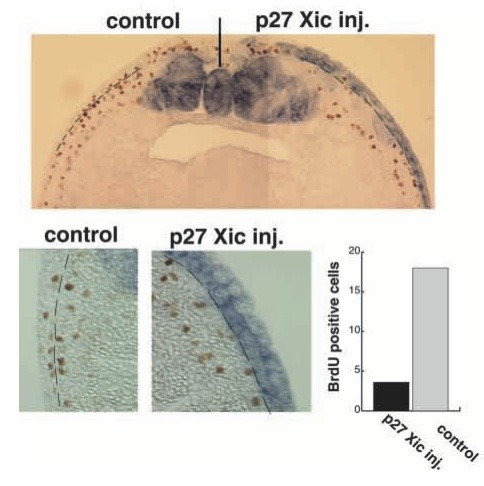 Fig. 6. p27XIC1 blocks cell division when misexpressed. p27XIC1 misexpression abolishes BrdU incorporation in the ectoderm. Embryos were injected with p27XIC1 RNA at the two-cell stage and processed for p27XIC1 expression by in situ hybridisation (blue/purple) and BrdU incorporation (brown nuclei) in transverse sections. In situ hybridisation with a p27XIC1 probe revealed both the expression of the endogenous gene and the distribution of the injected p27XIC1 RNA, both of which coincide with a complete absence of BrdU staining. The numbers of BrdU positive cells on the p27XIC1 injected side in comparison with the uninjected side are also represented as a column chart. The BrdU count is represented as BrdU positive cells per section, over the neural fold area and was averaged from 15 sections over three embryos in two independent experiments. Sections scored were from the anterior spinal cord level. Error bars were too small to illustrate.
