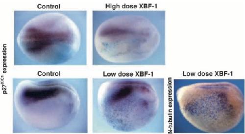 Fig. 7. XBF-1 regulates p27XIC1 in a dose-dependent manner. Embryos were injected with either a high or a low dose of XBF-1 RNA and analysed for expression of p27XIC1 or N-tubulin. A high dose of XBF-1 suppressed p27XIC1 and repositioned residual p27XIC1 expression laterally (top right panel, dorsal view) while a low dose induced ectopic p27XIC1 in the lateral ectoderm (bottom middle panel, side view), in the same way that a low dose of XBF-1 induces ectopic N-tubulin (shown for comparison in bottom right panel). XBF-1 RNA was coinjected with lacZ RNA as a lineage marker; embryos injected with lacZ alone were normal (left panels).