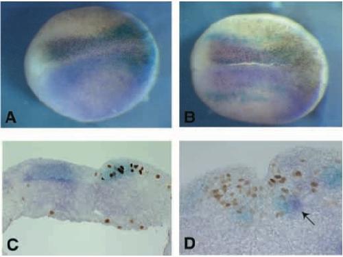 Fig. 8. p27XIC1 misexpression does not alter the pattern of expression of N-tubulin or XSox3. p27XIC1 misexpression has no effect in inducing ectopic XSox3 (A,C) or N-tubulin (B,D) expression. Embryos were injected with p27XIC1 RNA and were analysed for p27XIC1 (magenta), XSox3 (light blue, A,C) and N-tubulin expression (light blue, B,D) and for BrdU incorporation (brown nuclei). Magenta colour shows primarily the ectopic p27XIC1 expression although some endogenous expression can be seen in B. Cells expressing p27XIC1 did not incorporate BrdU; however cells in the neural plate that were expressing injected p27XIC1 still expressed XSox3, excluding the possibility of non-specific toxic effects of p27XIC1. Arrow in D, shows a cell within the neural plate that has received p27XIC1 RNA but does not express N-tubulin.